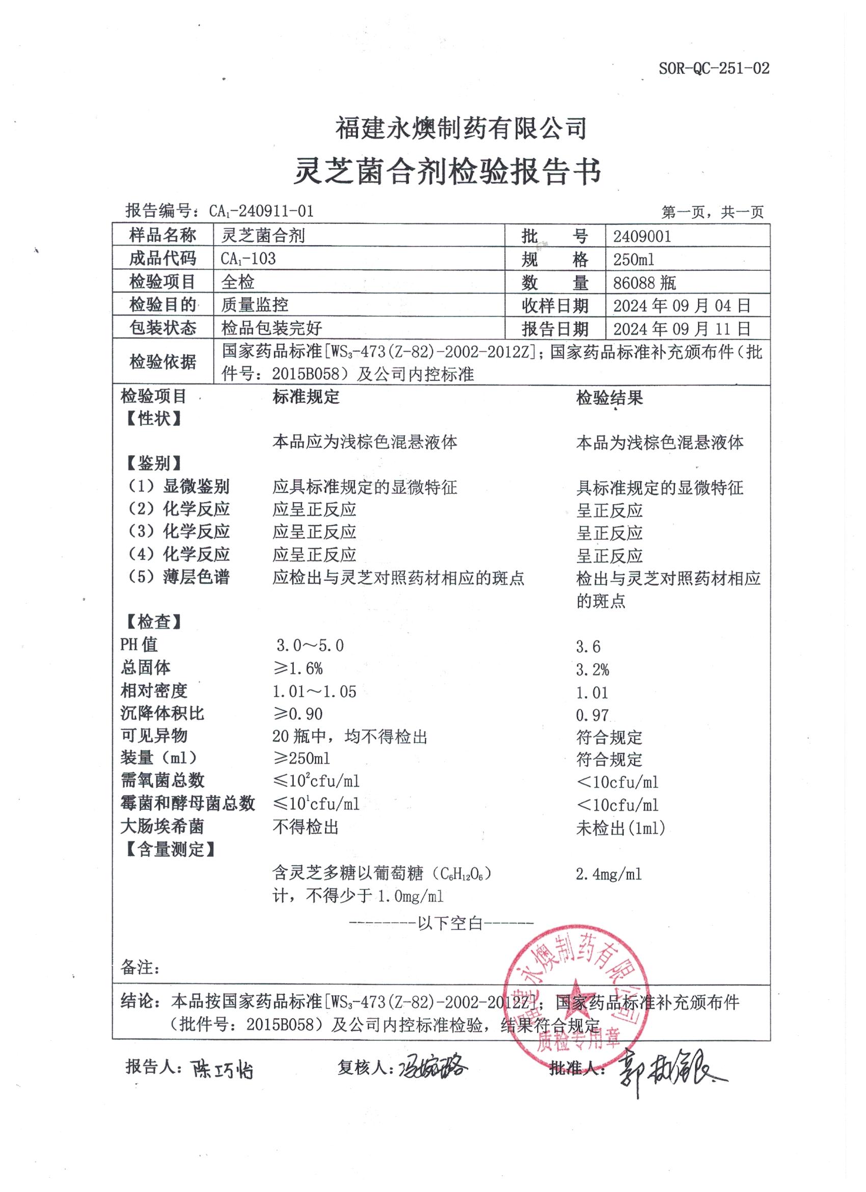 上一篇:灵芝菌合剂检验报告书-批号:2411001