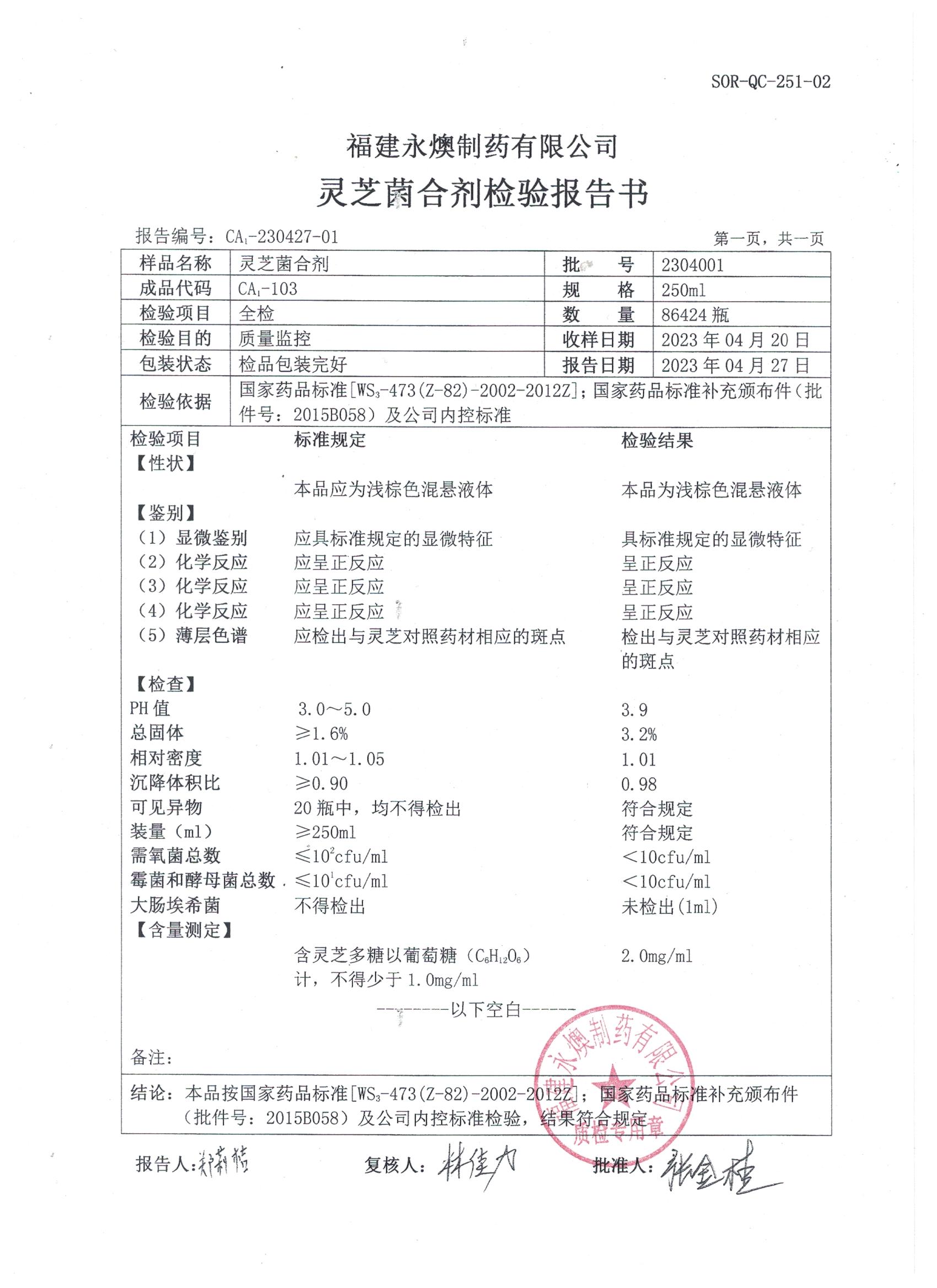 灵芝菌合剂检验报告书-批号:2304001